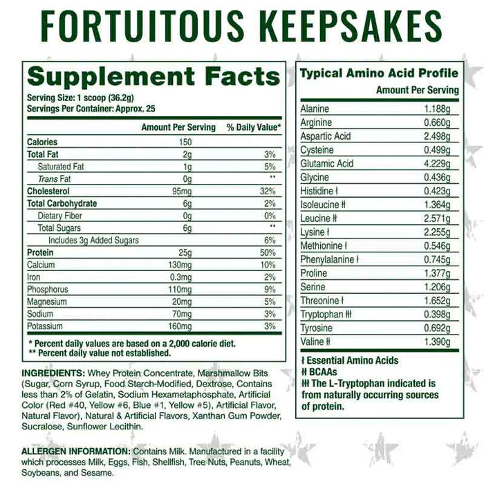 Whey protein with freedom in every scoop. Fortuitous Keep by ‘Merica Labz is a premium 100% whey protein blend designed to fuel gains, crush cravings, and taste like victory. With high-quality protein sources and flavors inspired by America’s favorite cereals, Fortuitous Keep is a post-workout dream and an all-day treat — without unnecessary sugars or fillers.