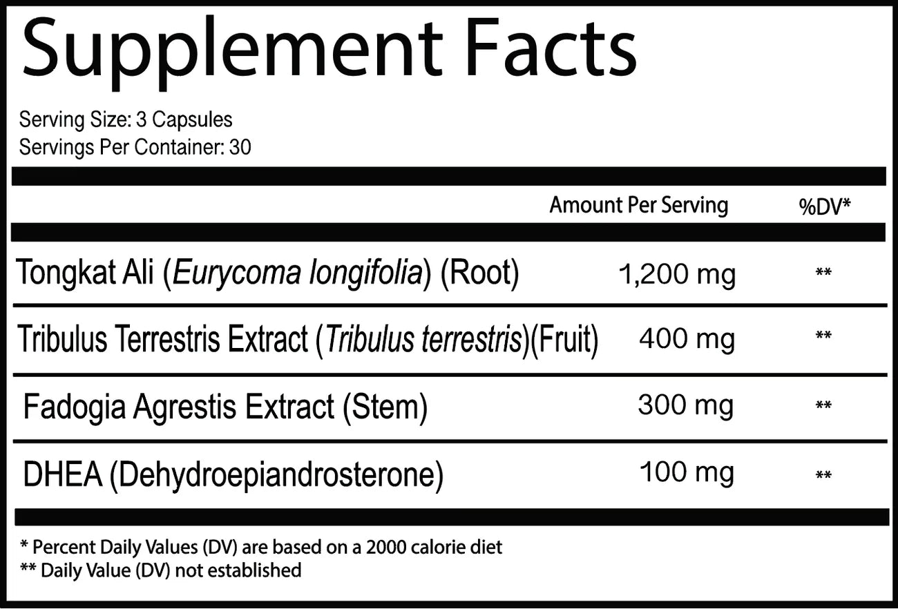 Tongkat Ali (1200 mg): Also known as Longjack, this powerful herb has been used for centuries in traditional medicine to naturally boost testosterone levels, improve stamina, and support overall male health. Our premium Tongkat Ali extract is meticulously sourced to provide maximum efficacy.